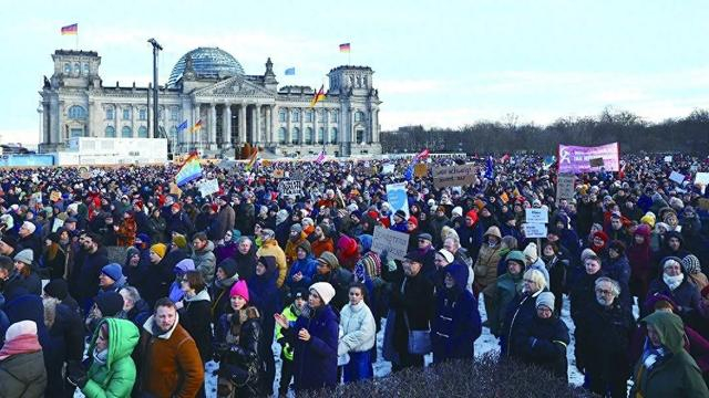 当地时间21日,德国民众在位于柏林的国会大厦前举行反对极右翼势力的示威活动。(法新社)
