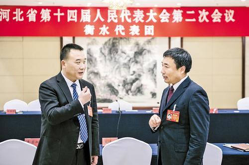 1月21日,省人大代表、衡水市农业农村局种植业科(种业管理科)科长李欣华(右)同省人大代表、河北裕丰京安养殖有限公司总经理魏立佳围绕“河北净菜”展开讨论。 河北日报记者 李东宇摄