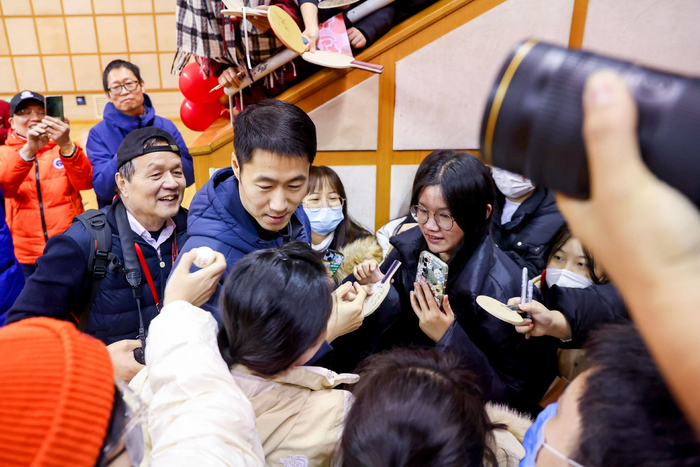 “我早上7点多就到球馆了,当时刘诗雯刚到球馆热身,还有点睡眼惺忪的感觉。”一位球迷拿着刘诗雯的签名手幅告诉澎湃新闻记者,“我还有两个朋友是从江苏坐最早的高铁赶过来的,就为了来看刘诗雯。”
