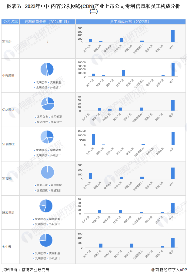 从内容分发网络(CDN)行业的上市企业已有的公开信息分析,专利信息相对较多的企业是中兴通讯,其中发明专利26616条;员工总数最多的也是中兴通讯,员工总数为74811人;研发人员相对最多的是七牛云,研发人员总数为172人。