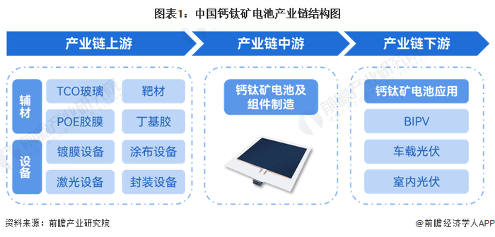 钙钛矿电池产业链上游包括TCO玻璃、靶材、POE胶膜、丁基胶等辅材以及镀膜设备、涂布设备、激光设备、封装设备等设备,其中以镀膜设备(PVD、RPD)、涂布机、激光设备为核心;中游为钙钛矿电池及组件制造;下游为钙钛矿电池应用,包括BIPV(光伏建筑一体化)、车载光伏、室内光伏等。