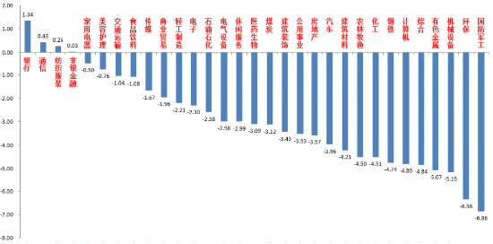 31个申万一级行业中,银行(+1.34%)、通信(+0.43%)和纺织服装(+0.26%)居涨幅前三。国防军工(-6.86%)、环保(-6.36%)和机械设备(-5.15%)居跌幅前三。