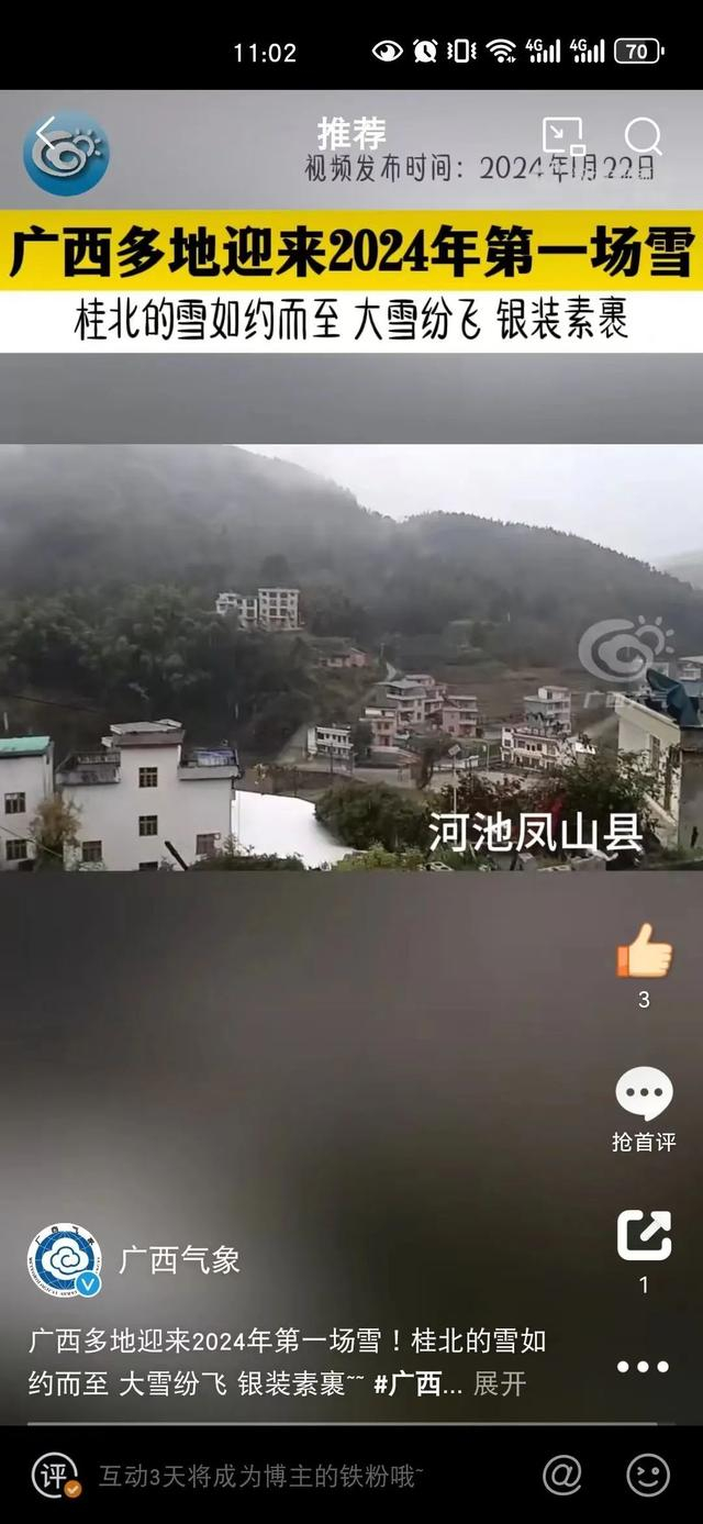全州、资源、灌阳、灵川、象山、七星、融安、融水、三江、富川、钟山、平桂、金城江、天峨、罗城、南丹、东兰、凤山、巴马、环江、都安、大化、乐业、凌云、武鸣等25个县(市、区)出现雪、雨夹雪、冻雨、冰冻或道路结冰。