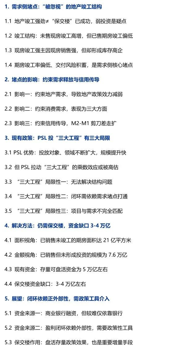 堵点的影响:约束需求释放与信用传导。1)影响一:约束地产需求,导致地产政策效力减弱。地产需求侧政策加码已推动一手现房、二手房销售强劲,居民潜在购房需求并不弱,但担心期房交付风险、“不敢买房”,期房权重又最大,导致整体地产销售表现偏弱,因此出现强政策、弱销售格局。2)影响二:约束消费需求,表现为三大方面。其一是已购置期房的居民担心存量资产未来交付,因而预防式储蓄应对将来风险,挤压消费。其二是由于地产需求无法释放、导致房价下跌,而居民房贷偿债支出刚性,导致居民偿债压力增加、约束消费。其三是导致竣工链消费不及预期。3)影响三:约束信用传导,M2-M1剪刀差走扩。其一是居民部门信用难以向企业部门传导,二手房销售并不通过企业部门、信用派生乘数较低,这也意味着火热的二手房成交无助于缓解M2-M1剪刀差以及GDP压力。其二是企业部门本身内生信用需求也偏弱。核心也在于期房复工偏慢、交付风险仍存。