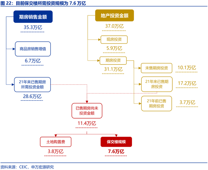 1)计算期房销售中所需投资规模,估算2021年至今为28.6万亿。2021年至今,总体期房销售金额为35.3万亿,其中6.7万亿归属于商品房销售增值,也即房地产企业合理利润,剩下的部分为需要形成投资的金额,估算为28.6万亿。