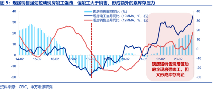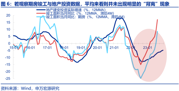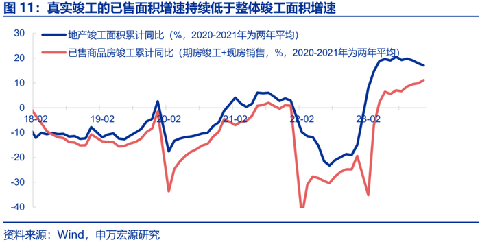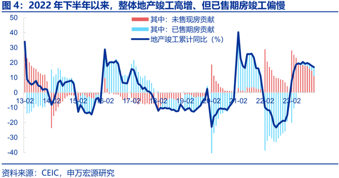 若观察期房竣工与地产投资数据,平均来看则并未出现明显的“背离”现象。虽然整体地产投资增速与竣工面积增速背离,但若观察已售期房竣工增速,自2022年下半年以来温和改善,2022年为-24.8%2023年为8.7%,两年平均-9.6%,实际上与地产投资增速整体较为匹配。