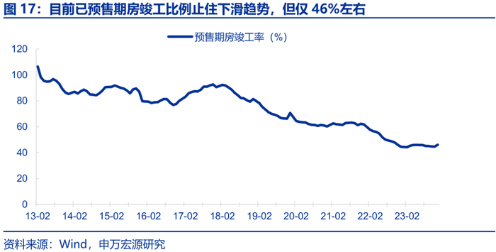 “保交楼”政策止住了竣工率的下行趋势,但绝对水平仍偏低,期房交付风险仍是目前内循环的核心堵点。通过计算往年销售期房当前竣工比例的数据可以发现,在2018年之前,我国预售期房竣工率总体在80%~90%的高位水平,而2018年资管新规后房企博弈预售融资,预售期房获得回款后放缓之后的施工进度、拉长施工周期,导致期房竣工率持续下滑,2022年下半年以来“保交楼”政策只是稳住了竣工率下行趋势,但绝对水平(46%)仍然偏低,期房交付风险仍是目前内循环的核心堵点。