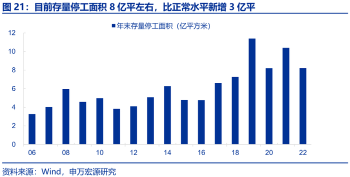 市场此前认为部分房企“避税”导致统计局公布的竣工面积低估了真实竣工,但实际上低估程度并不大。此前市场认为,由于部分房企为了规避税收,当商品房竣工时并未统计在“竣工面积”指标里,导致统计局公布的“竣工面积”低估了真实竣工情况。但其实总量影响不大,其一是因为房企只有房屋竣工才能结转收入,才会影响利润表,其二是因为虽然停工面积2018年后大幅走高,但绝对水平来看,目前存量停工面积也就8亿平左右,比正常水平新增3亿平,就是将这3亿平全部理解为“竣工避税效应”,那也只意味着目前已销售但未竣工的规模为18亿平,与21亿平差距并不大。