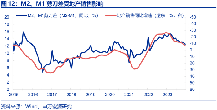 目前M2增速大幅高于M1增速,核心原因之一在于期房交付风险,进而影响信用传导。202312M2同比9.7%,大幅高于同期M2同比1.3%。核心在于期房交付风险导致居民预防式储蓄,推升M2,而并未形成地产销售进入企业活期存款、推升M1,历史上M2M1剪刀差较大的阶段也多为地产销售偏弱的阶段。