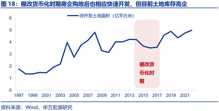 2)目前房企土地库存偏高,也会约束购地积极性。房企只有在对未来地产需求判断乐观的时候,才会加快拿地与新开工,目前在地产需求偏弱阶段,房企也出现持续的积压土地库存的情况,2022年待开发土地面积达到为5亿平方米的历史新高。2023年在地产新开工继续偏弱背景下,土地库存预计仍偏高。