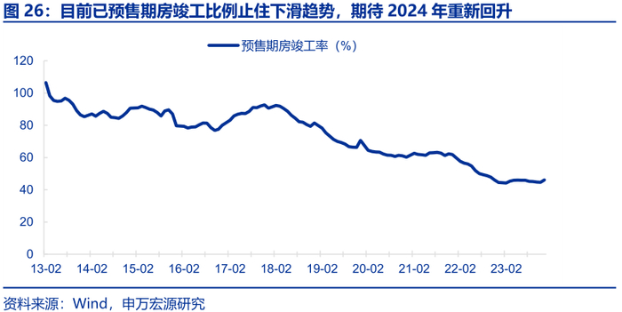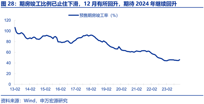 而目前需求侧堵点才是更关键的约束政策效果的问题,因此展望后续政策,若要以相对较小的政策规模撬动更大的政策效应,核心是释放存量政策效果,这也需要破解目前需求侧堵点,进而需要“保交楼”加快推进。目前测算保交楼总体资金缺口为4万亿,预计年化资金缺口为1万亿左右,而由于保交楼的盈利依赖正外部性,这一资金缺口只能依赖政策性金融工具,期待后续PSL投向范围扩容至保交楼,同时条件成熟后适当引入财政资金。我们在2023年已看到期房竣工率止住下滑趋势,12月有所回升,希望2024年能继续回升,进而释放政策效果、促进需求回升。