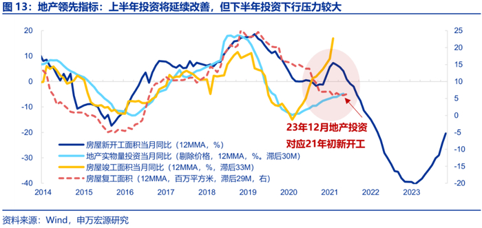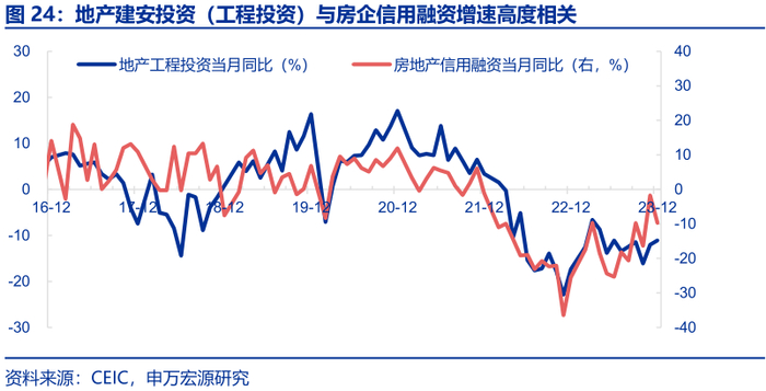与此同时,从企业自身信用需求来看,下半年地产投资下行风险本身就将约束信用需求,而唯一有增量的存量房复工却进展偏慢。根据我们此前地产领先指标,2018年资管新规后房企拉长施工周期,新开工到竣工的传导时滞由2018年前的一年半拉长至目前接近三年,这也意味着,今年12月地产投资与复工对应的是21年初的新开工,而新开工21年上半年明显走强,对应今年上半年地产投资与竣工仍有支撑,背后逻辑在于更多地产项目临近复工时点。但21年下半年至22年新开工与期房销售大幅走弱,按传导时滞,将于2024年下半年集中性反映为新一轮地产内生性下行压力,内生性同比跌幅可能高达-20%~-30%,直接约束信用需求。而本来可贡献增量的存量房复工投资,目前却进展偏慢,这也意味着内生性信用需求下行风险较大。