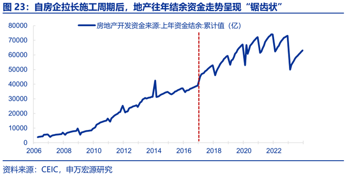 而伴随房企2018年后拉长施工周期,导致土地购置费等计入投资的时滞被拉长,也相应导致上年结余资金开始呈现“锯齿状”走势。土地购置费是伴随项目施工进度逐步计入地产投资,在当年项目施工计入土地购置费后,这一批往年支付的购地款项会在当年计入房地产资金来源,被认作使用上年结余资金。因此,统计局公布的“使用上年结余资金(包含在“实际到位资金”口径中)”会呈现年初数据较低,年中伴随土地购置费的计入、数据走高,年底高于年初的“锯齿状”走势,而次年年初,这一批被使用的土地购置款会剔除出“上年结余资金”中,数据会再度走低。这也是因为房企2018年后拉长施工周期,土地购置费计入工程投资的时滞被拉长、甚至跨年。