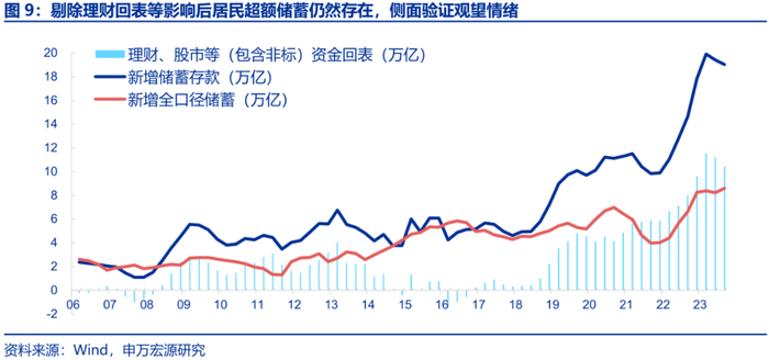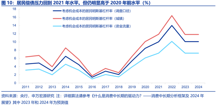 2)由于地产需求无法释放、导致房价下跌,而居民房贷偿债支出刚性,导致居民偿债压力增加、约束消费。由于居民担心期房交付,虽然部分需求形成新房现房与二手房销售,但更多的居民选择观望,也是导致超额储蓄增加的另一原因。因此地产政策力度虽然强劲,但未推动整体地产需求释放、也相应无助于解决房价下跌风险。而在房价上升时期,居民房贷支出固定、而财富效应升值,居民往往衍生出消费需求,同时无需担心偿债压力。但在房价下行周期,刚性的房贷支出反而加剧了居民的偿债压力,结合我们的测算,当前考虑房价、理财收益率后的居民真实偿债杠杆率在2023年已经回到7.3%,和2021年持平,但也明显高于2019年前4%左右的水平,意味着当前偿债对于居民的负担还没有回到疫情前水平,或预示着居民仍处于修复自身资产负债表的状态中、相应挤压消费需求。
