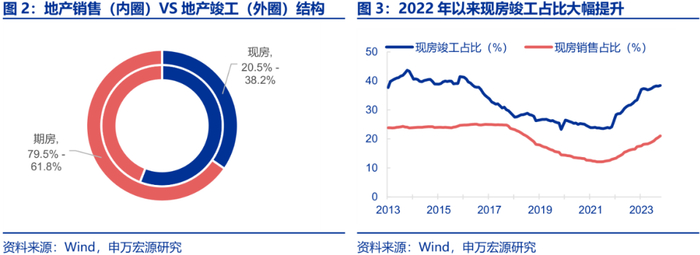 虽然现房在地产销售中占比较低,但在竣工中占比高达4成,且2022年以来快速提升。地产销售结构中,20.5%为现房销售,79.5%为期房销售。但在地产竣工结构中,38.2%为现房竣工,61.8%为期房竣工,且现房竣工从202225%左右快速提升至2023年近40%