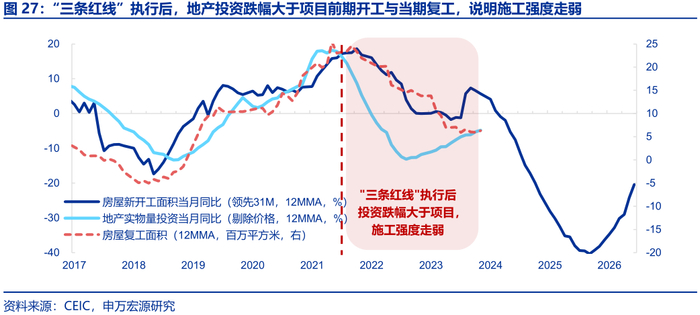 2021年“三条红线”后,房企融资压力进一步加大,地产施工周期被第二次拉长。2018年资管新规后,房企信用融资面临第一轮收紧,地产企业通过预售期房融资、同时放缓后续施工进度的方式,来缓解资金压力,彼时也导致地产施工周期被第一次拉长,相应有大量项目施工进度放缓、竣工延后。而2021年“三条红线”政策导致地产施工周期被第二次拉长,项目施工进度一度进一步放缓。