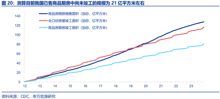 若只考虑2021年以来第二轮地产施工周期拉长的阶段,目前已销售但未竣工的期房面积也达到21亿平。2021年至2023年三年时间里,期房销售面积总计达到32.8亿平,但期房竣工面积只有20亿平,且20亿平还包含2021年前销售的期房,即使仅扣除2019年一年销售的期房在2021年后竣工的面积,期房竣工面积仅剩12.1亿平,根据12.4亿平来估算,近三年销售的期房中仍有20.6亿平未竣工。