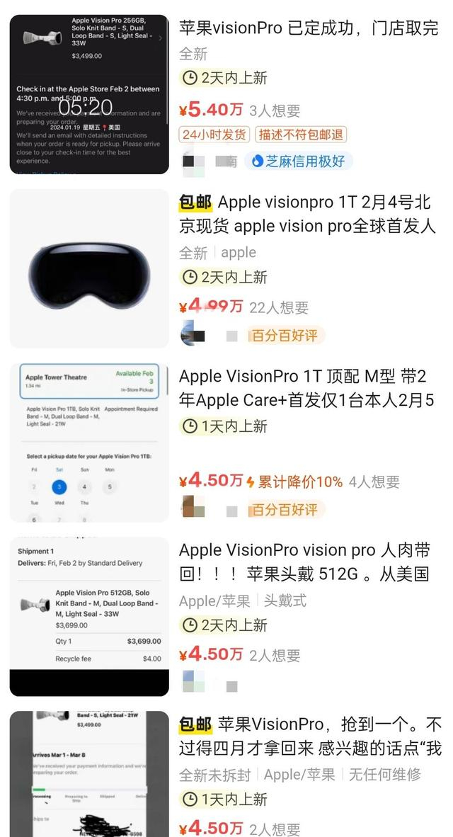 1月22日,记者联系了二手交易平台上多位卖家,一台256G的Vision Pro代购价格从3.4万元到6万元不等,不同内存大小的差价在2500元左右。有直接从美国邮寄回国的,也有表示可以“人肉”背回来,最快2月5日就能到国内。“落地后给您发顺丰,全程视频装箱”一卖家说道。