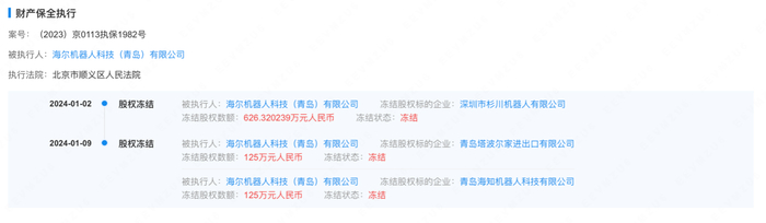 而在此之前的1月2日,海尔机器人在深圳市杉川机器人有限公司(下称“杉川机器人”)持有的626.320239万元股权也遭到冻结。
