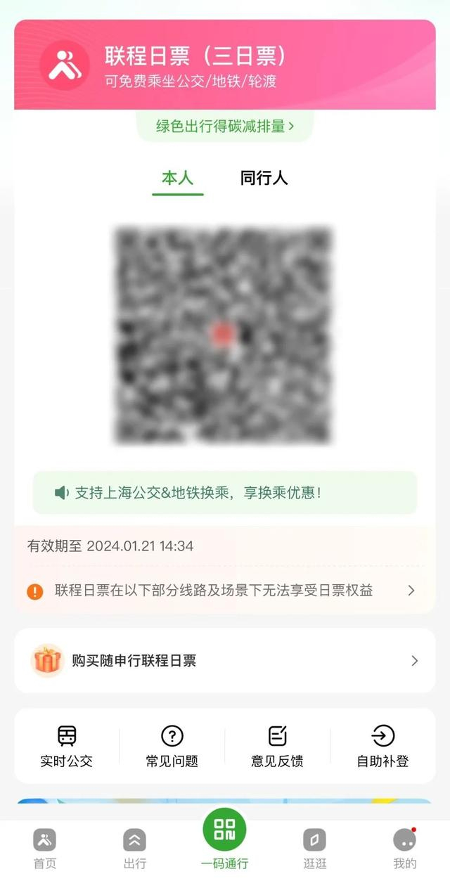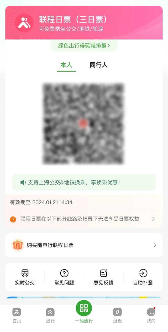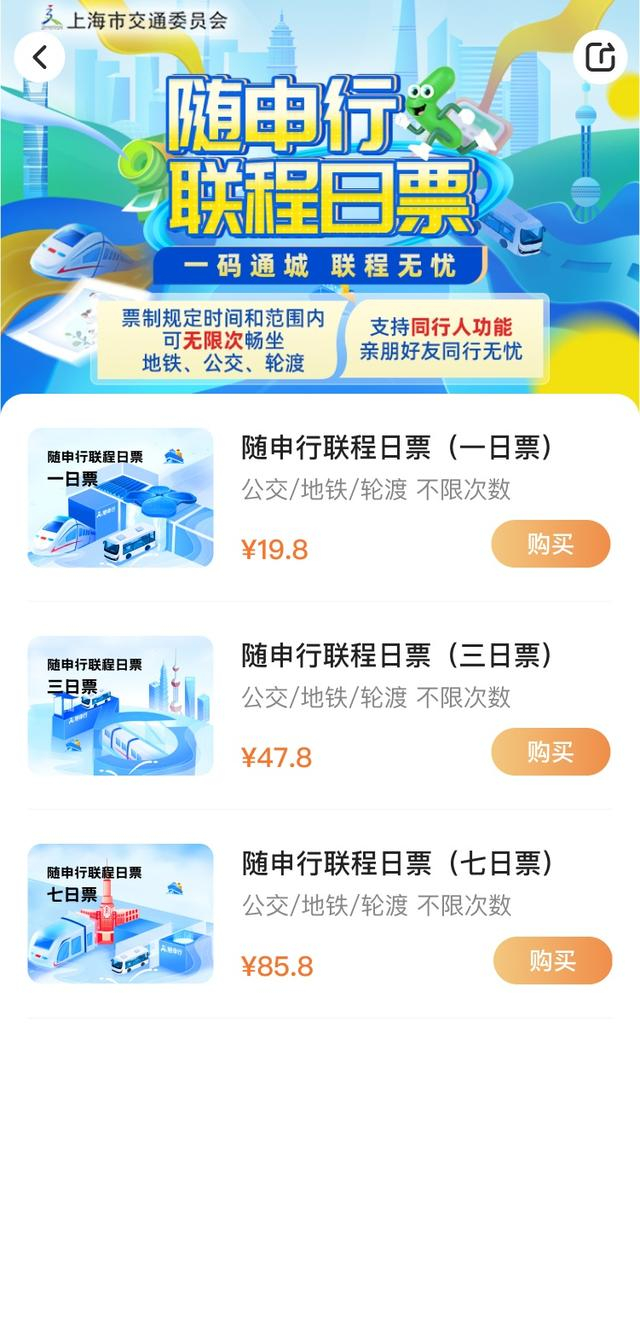 即日起,市民登录上海市绿色出行一体化平台“随申行”APP或微信小程序,购买并启用“联程日票”,即可在有效时间内不限次乘坐上海地铁、公交和轮渡。同时支持为同行人购买联程日票,一部手机全家畅行上海。