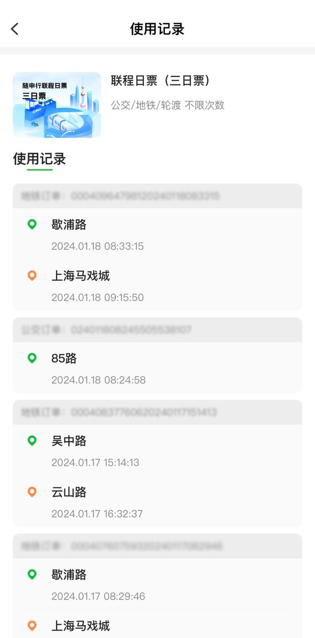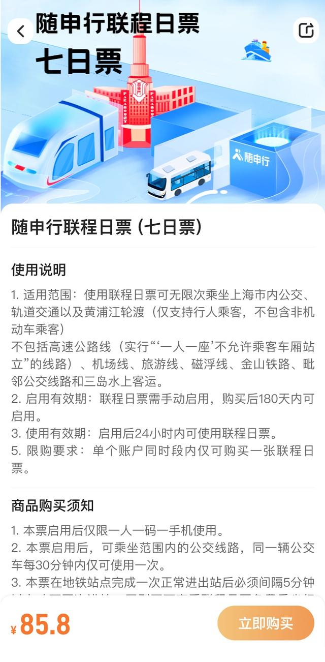 打开“随申行”APP或微信小程序,点击首页【联程日票】,按需选择一日票、三日票或七日票。购买成功后,根据页面提示立即启用(需先完成实名认证并且绑定免密支付渠道)。订单详情可在【我的】-【订单详情】-【使用记录】查看。