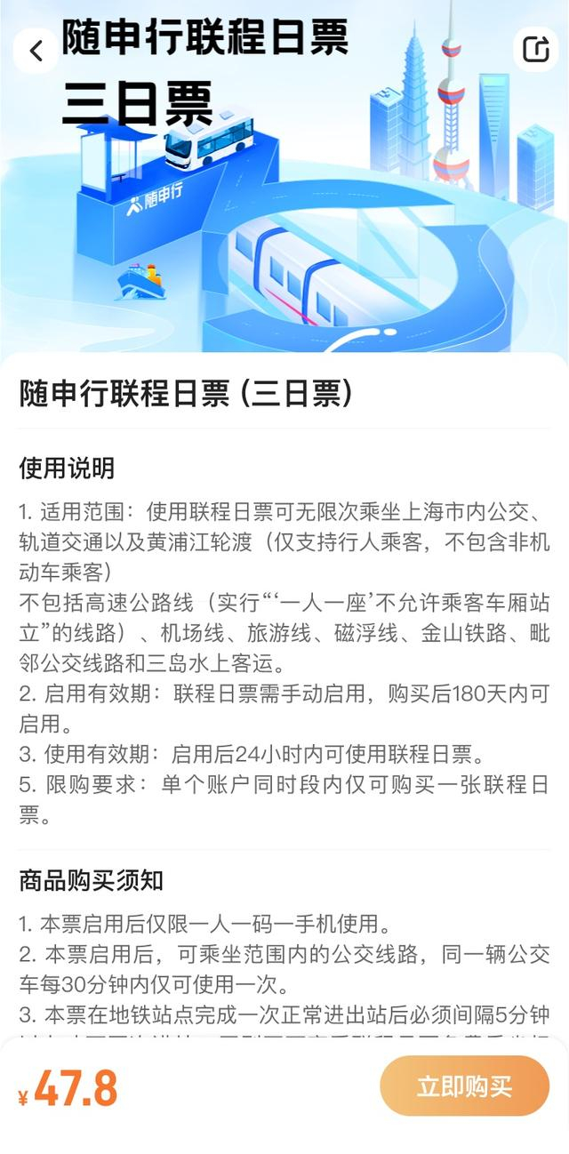 作为上海市多元化票制的探索和试点,联程日票(一日票)自去年9月上线以来,受到了来沪旅客和本地市民的欢迎。为进一步丰富游客群体在上海市内的便利出行,上海MaaS平台“随申行”上线“联程日票”(三日票)。只需47.8元,无需反复排队购票,即可在3日内畅享公共出行,不限次乘坐公共交通,这将极大方便外地来沪游客。