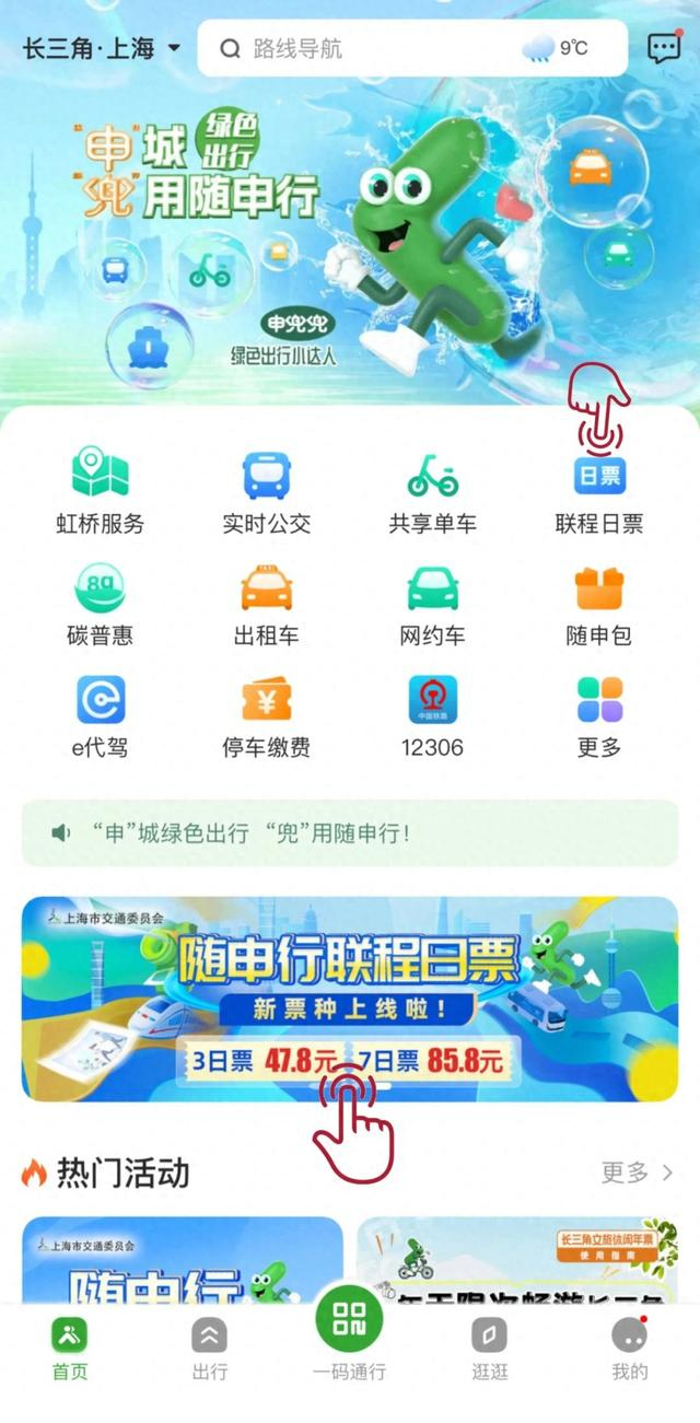 登录“随申行”APP或微信小程序,进入“联程日票”