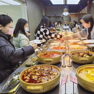 蒜蓉粉丝蒸扇贝、香辣干锅鱿鱼鸡翅、卤水鸡腿、白灼虾、湘味红烧肉…… 1月17日中午11时30分,盛达广场5楼的金城食府如往常一样人声鼎沸。这是一家称重式快餐店,一两售价2.98元。前来就餐的顾客拿着分餐盘有序排队,在摆有40种菜品的餐台上挑选喜爱的食物后,到收银台称重结账。一旁的主食区,米饭免费不限量供应,橙汁、柠檬汁、红枣茶、浆水拌汤、虫草鸡汤等饮品也是无限量免费供应。结账后,在此打米饭及拿饮品的顾客排起了长龙。