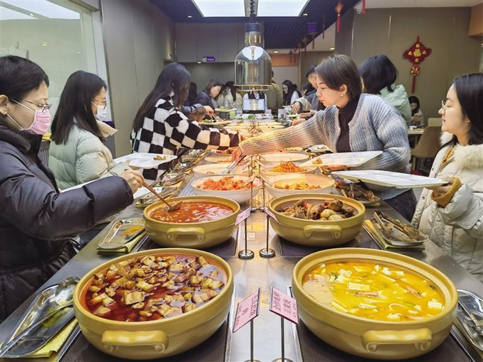 顾客在金城食府排队选菜