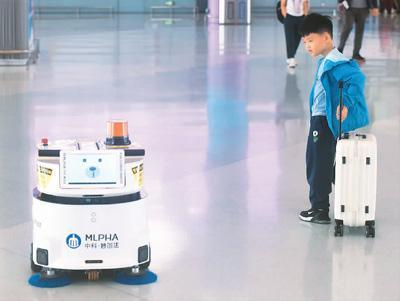 2023年10月8日,小旅客在浙江省杭州市萧山国际机场候机大厅观看微型智能扫地机器人进行保洁作业。 龙 巍摄(人民图片)