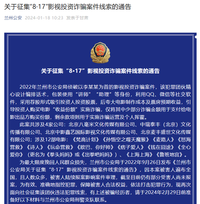 1月16日,兰州市人民检察院、兰州市公安局联合发布通告,征集一起影视投资诈骗案件线索。希望在该案中受骗的群众携带相关证据材料,于2024年2月29日前往公安机关报案。