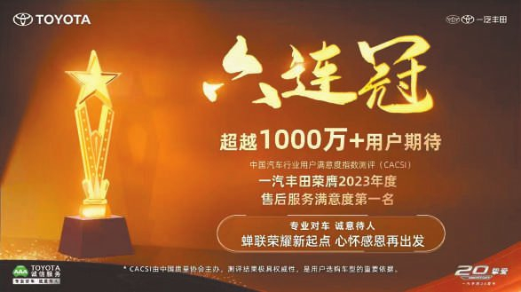 一汽丰田的高品质除了为用户提供高价值的产品,还展现在全生命周期的高价值服务。在2023年由中国质量协会主办的中国燃油汽车行业用户满意度指数测评中,一汽丰田连续4年蝉联合资品牌销售服务满意度指数以及售后服务满意度指数的双料冠军,其中售后服务满意度更是六连冠。