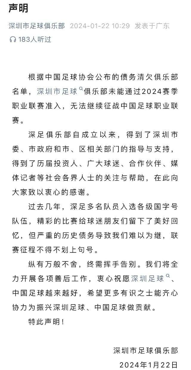 原因早已众人皆知,深足官方声明不过是例行公事:俱乐部未能通过2024赛季职业联赛准入,无法继续征战中国足球职业联赛……严重的历史债务导致我们难以为继……