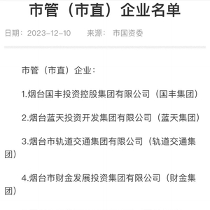 泰山财经记者注意到,烟台政府网去年12月10日披露了最新的12家市管(市直)企业名单,按照排序依次为:烟台国丰投资控股集团有限公司(国丰集团)、烟台蓝天投资开发集团有限公司(蓝天集团)、烟台市轨道交通集团有限公司(轨道交通集团)、烟台市财金发展投资集团有限公司(财金集团)、 万华化学 集团股份有限公司(万华化学)、 冰轮环境 技术股份有限公司(冰轮环境)、 泰和新材 集团股份有限公司(泰和新材)、 东方电子 集团有限公司(东方电子)、烟台张裕集团有限公司(张裕集团)、烟台市公交集团有限公司(公交集团)、山东裕龙石化产业园发展有限公司(裕龙发展)、烟台银行股份有限公司(烟台银行)。