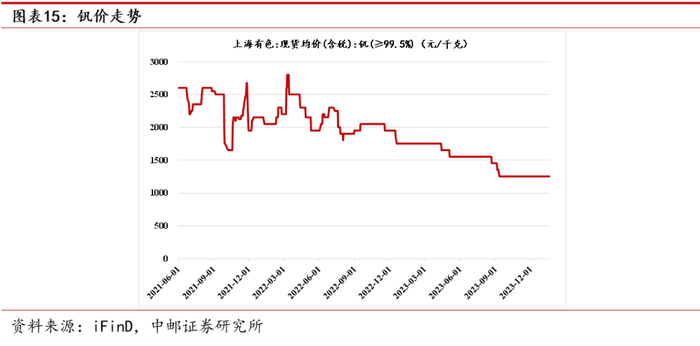 钛合金的原材料成本构成中,海绵钛占比约60%,中间合金占比30%-40%,由于金属钒价格相对较高,铝钒合金价格变化主要受钒价变化的影响。