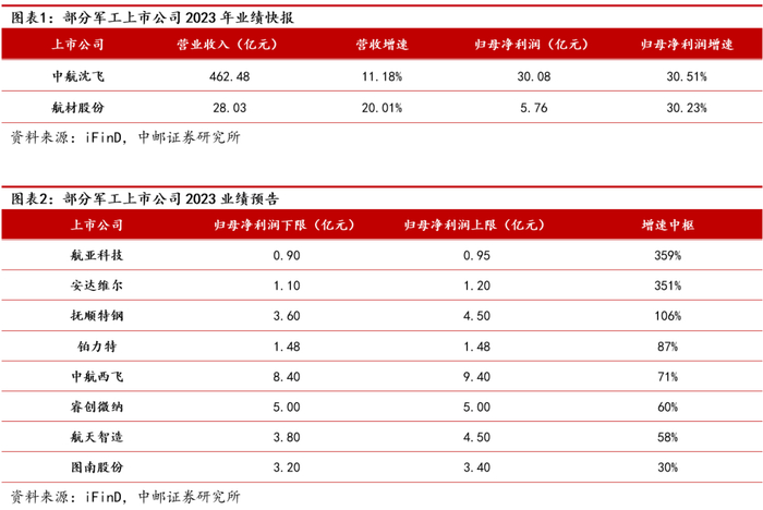 截至1月21日,中航沈飞和航材股份等披露2023年业绩快报,中航西飞、图南股份、航亚科技、铂力特、抚顺特钢、安达维尔、睿创微纳、航天智造等披露2023年业绩预告。