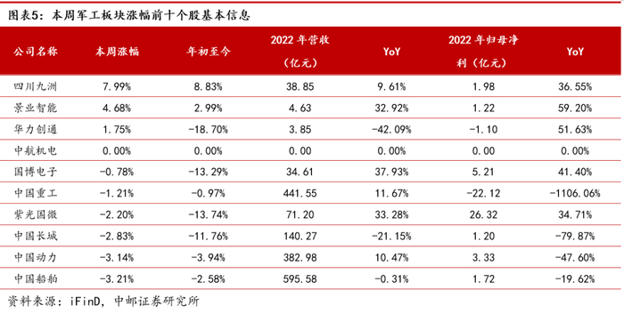 本周军工板块涨幅前十的个股为:四川九洲(+7.99%)、景业智能(+4.68%)、华力创通(+1.75%)、中航机电(+0.00%)、国博电子(-0.78%)、中国重工(-1.21%)、紫光国微(-2.20%)、中国长城(-2.83%)、中国动力(-3.14%)、中国船舶(-3.21%)。