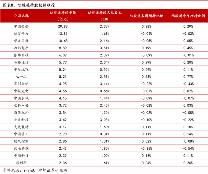 当前陆股通持有市值最多的军工标的为中国船舶(29.83亿元)、航发动力(13.81亿元)、紫光国微(10.68亿元);持股比例最高的军工标的为西部超导(3.51%)、睿创微纳(3.14%)、普天科技(3.03%)。
