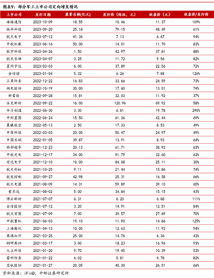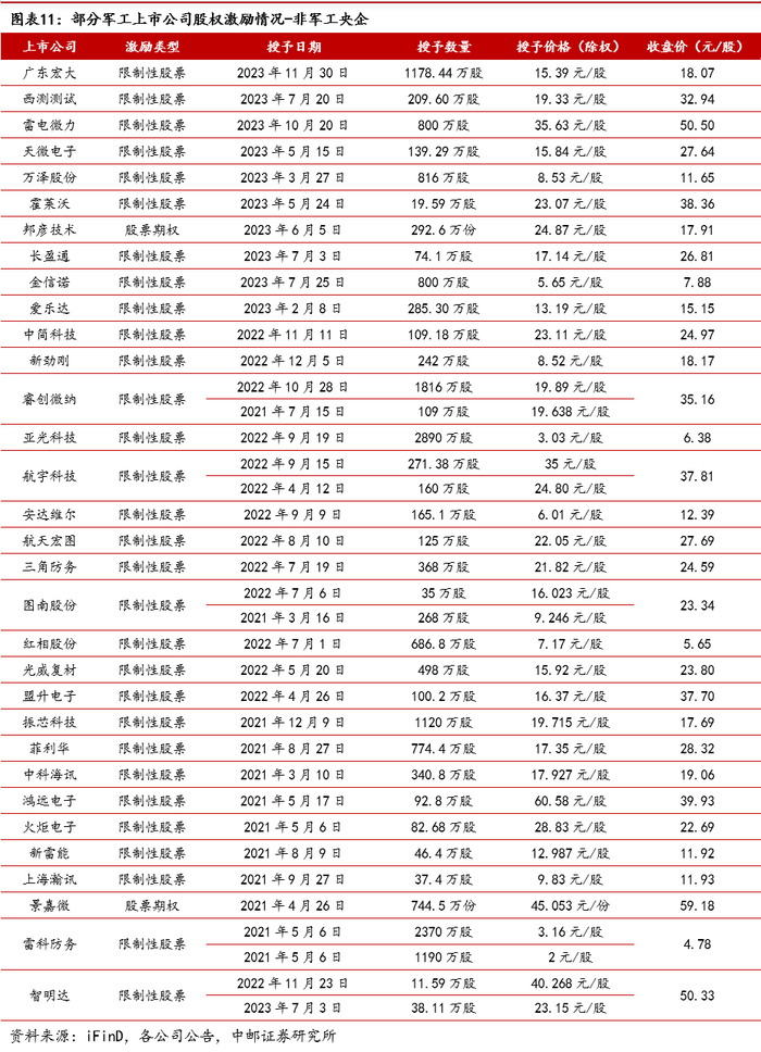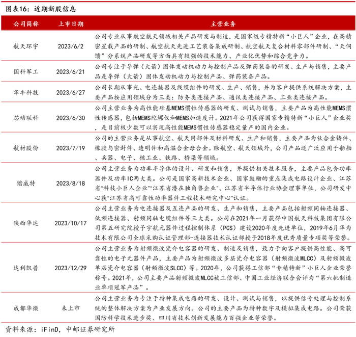2)军工新趋势,建议关注军工新技术、新产品、新市场,包括国睿科技、航天南湖、航天彩虹、芯动联科、华秦科技、光启技术、高德红外、臻镭科技、三角防务、润贝航科、海格通信、中国卫星、铖昌科技、航天电子、航天环宇、联创光电、国光电气等。
