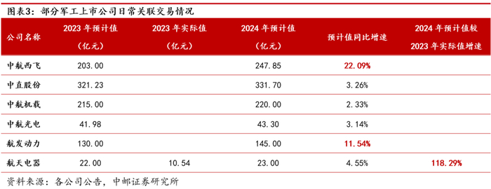 从前瞻性指标日常关联交易预计值看,航空航发主机厂如中航西飞、航发动力2024年日常关联交易预计值同比保持较快增长,中航西飞2024年日常关联交易预计值同比增长22%,航发动力2024年日常关联交易预计值同比增长12%。或受军工行业“十四五”规划中期调整等多因素影响,航天电器2023年日常关联交易完成度(实际值与预计值的比值)较低,2024年仍维持较高的日常关联交易预期,航天电器2024年日常关联交易预计值同比增长5%,较2023年实际完成值增长118%。