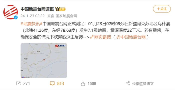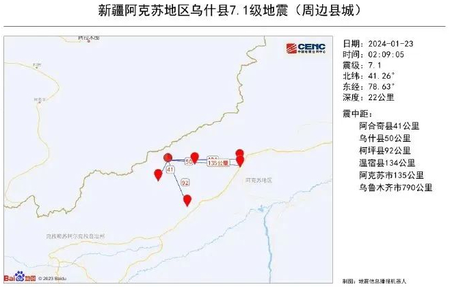 据中国地震台网正式测定,2024年1月23日2时9分,新疆阿克苏地区乌什县发生7.1级地震,震源深度22公里。