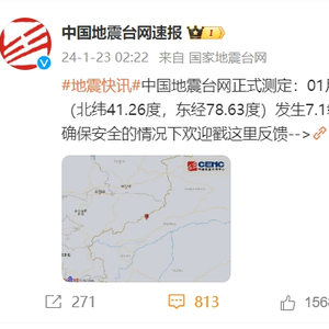 据中国地震台网正式测定,1月23日2时9分在新疆阿克苏地区乌什县发生7.1级地震,震源深度22公里,震中位于北纬41.26度,东经78.63度。此后又发生多次余震。目前中国地震局正在组织紧急会商,针对此次地震特点,中国地震台网中心高级工程师韩颜颜进行了解析。