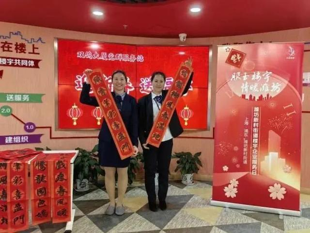 为更好地服务楼宇员工和新就业群体,让工作、生活在潍坊新村街道的党员群众感受到喜庆祥和的节日氛围,潍坊新村街道社区党群服务中心、总工会、街道商会日前联合开展“服至楼宇,情暖潍坊”送“福”字、送春联活动。