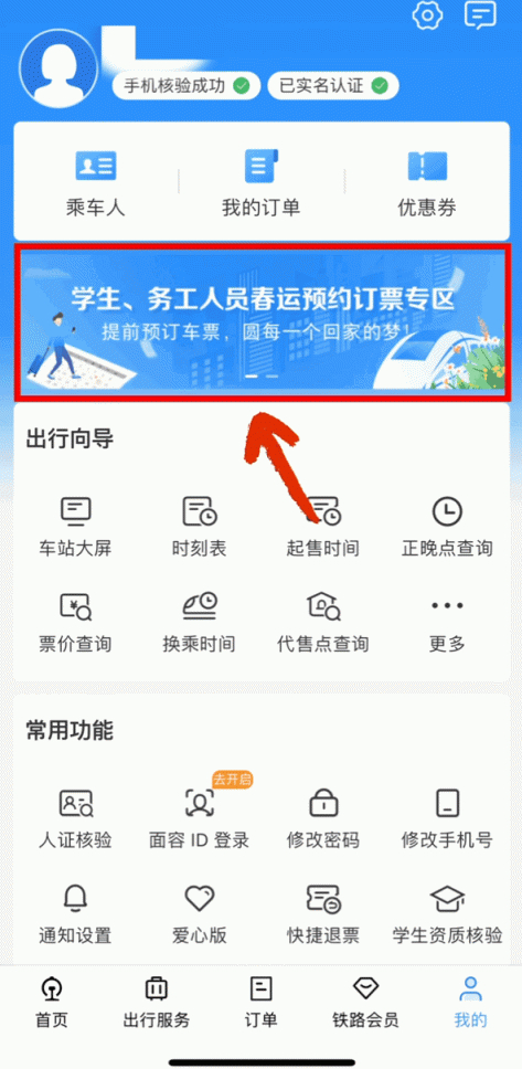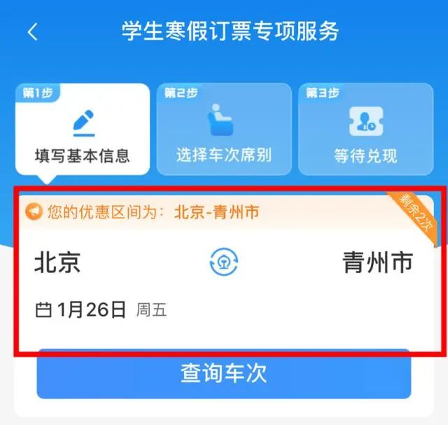 打开铁路12306App,进入“学生、务工人员春运预约订票专区”,点击“学生寒假订票专项服务”。系统将默认填写优惠乘车区间,并提示剩余优惠次数。