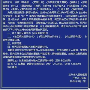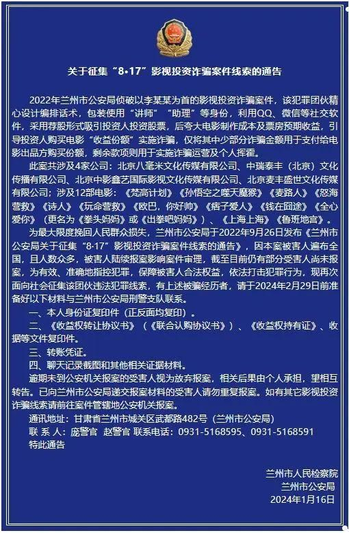 近日,兰州市人民检察院、兰州市公安局联合发布通告,公开征集“8·17”影视投资诈骗案件线索。通告显示,2022年,兰州市公安局侦破以李某某为首的影视投资诈骗案件,该犯罪团伙精心设计编排话术,包装使用“讲师”“助理”等身份,利用QQ、微信等社交软件,采用荐股形式吸引投资人投资股票,后夸大电影制作成本及票房预期收益,引导投资人购买电影“收益份额”实施诈骗,仅将其中少部分诈骗金额用于支付给电影出品方购买份额,剩余款项则用于实施诈骗运营及个人挥霍。