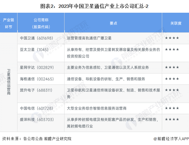 目前,我国卫星通信产业链上下游的上市公司数量较多,分布在各产业链环节。其中,涉及卫星通信产业链的上市公司包括:中国卫通、亚太卫星、星网宇达、海格通信、盟升电子、中国电信、盛洋科技等。