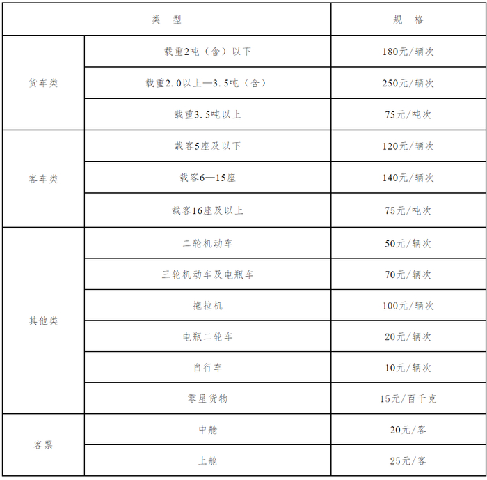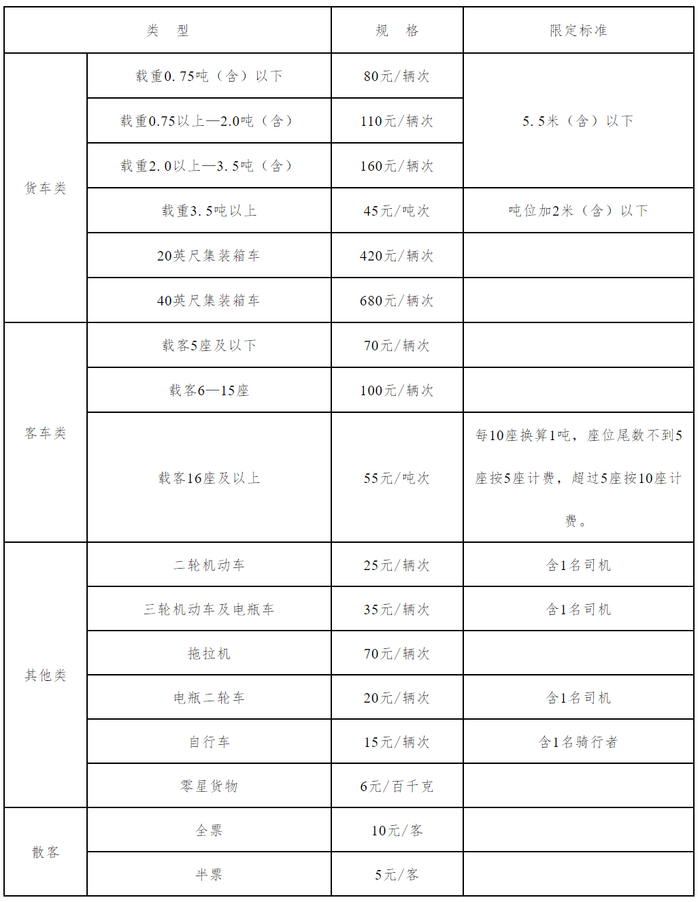 2、车辆收费实行车客分流按实计收,除自行车、电瓶自行车外,每辆车随带一名驾驶员。