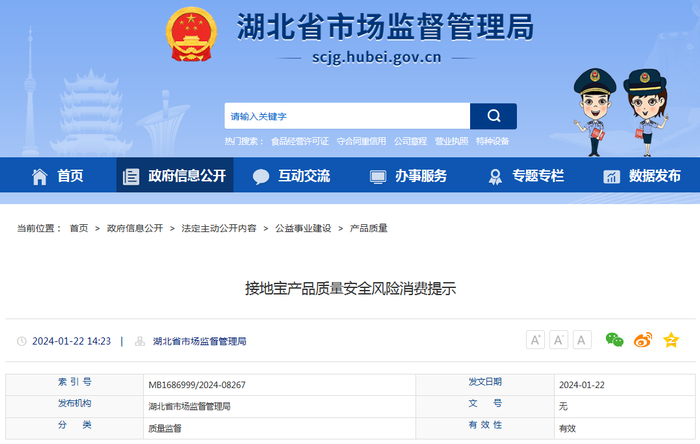湖北省市场监管局发布接地宝产品质量安全风险消费提示