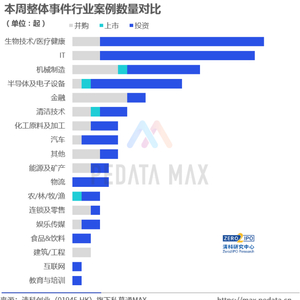 上周,生物技术/医疗健康、IT、机械制造投资并购事件较多。