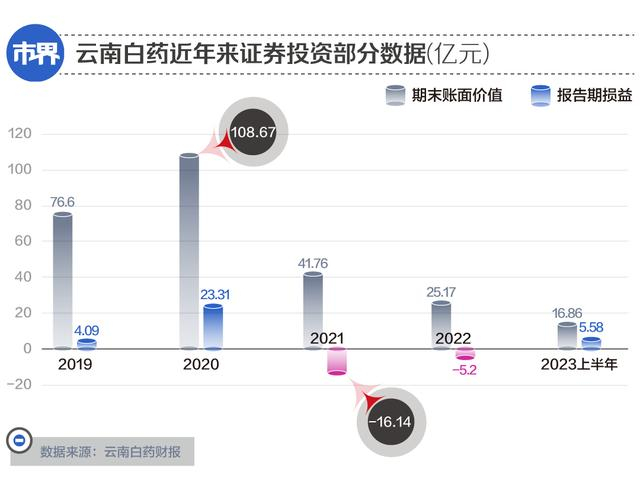 加之,陈发树成为云南白药史上独一份的联席董事长,借助当时的大好行情,在占尽“天时、地利、人和”的情况下,迈开“炒股”步子。仅2020年,云南白药证券投资的账面价值就高达108.67亿元,报告期损益23.31亿元,占其当期全年利润的超过四成,“股神”称号也由此产生。